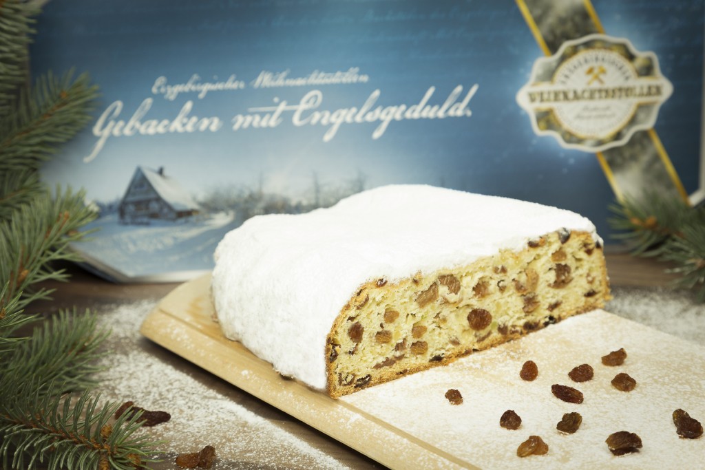 Original Erzgebirgischer Weihnachtstollen Nur echt mit dem Siegel. Stollenteigecken mit frischen gekochten, geriebenen Kartoffeln. Oblatenlebkuchen Tradition pur. Und lecker!